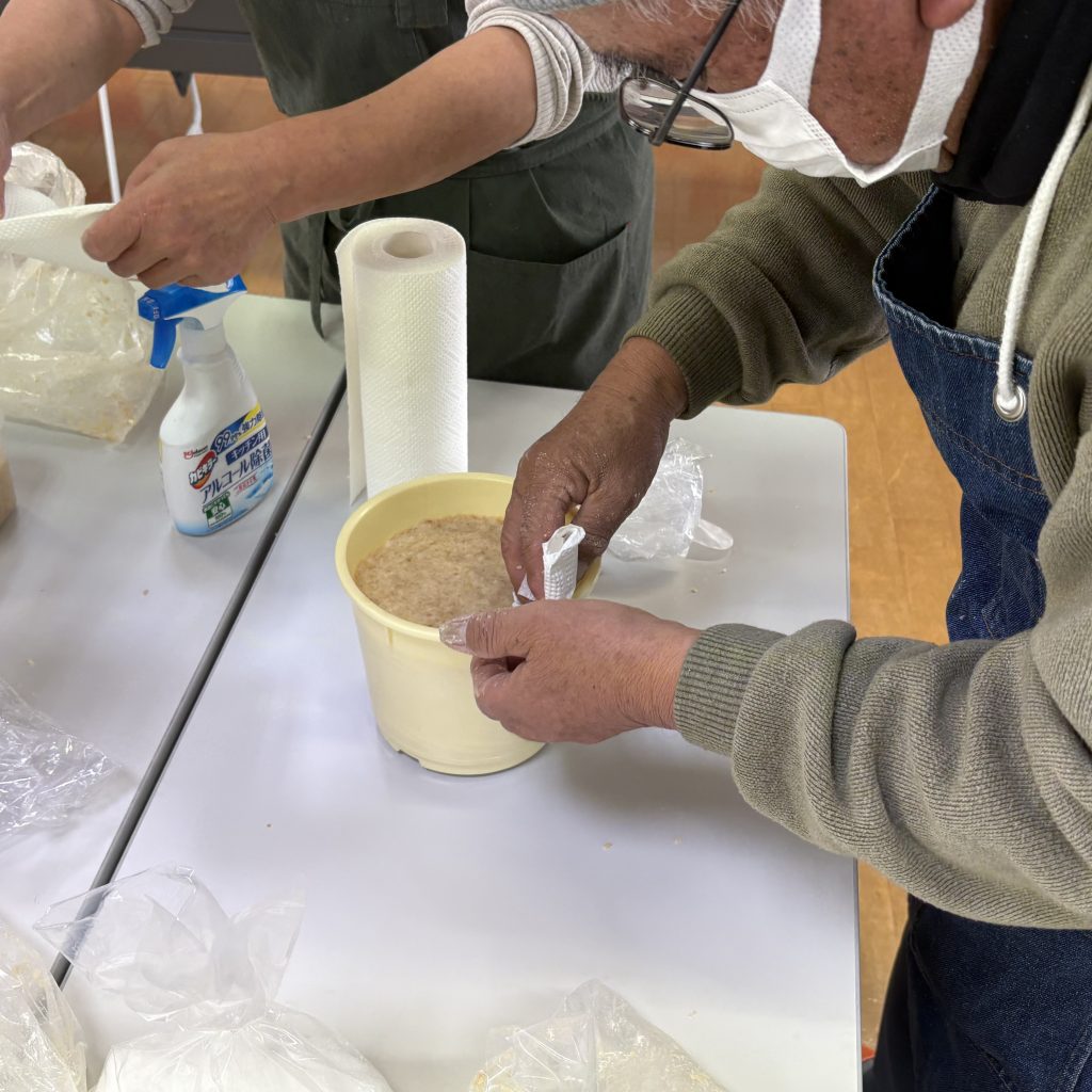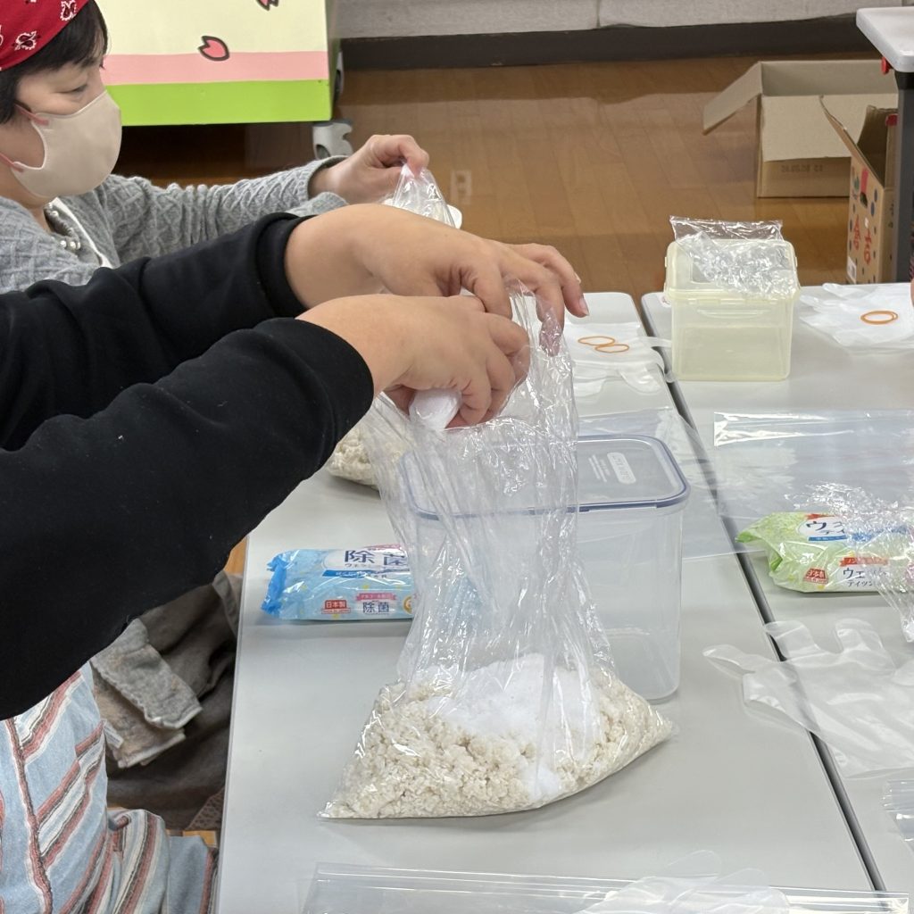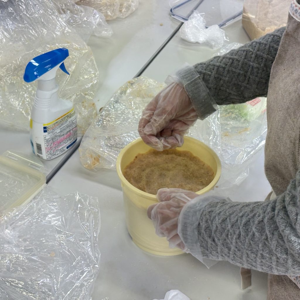 先生に一つ一つ手順を教わって、麹を混ぜて、大豆を潰して、しっかり混ぜて揉み揉み揉み。