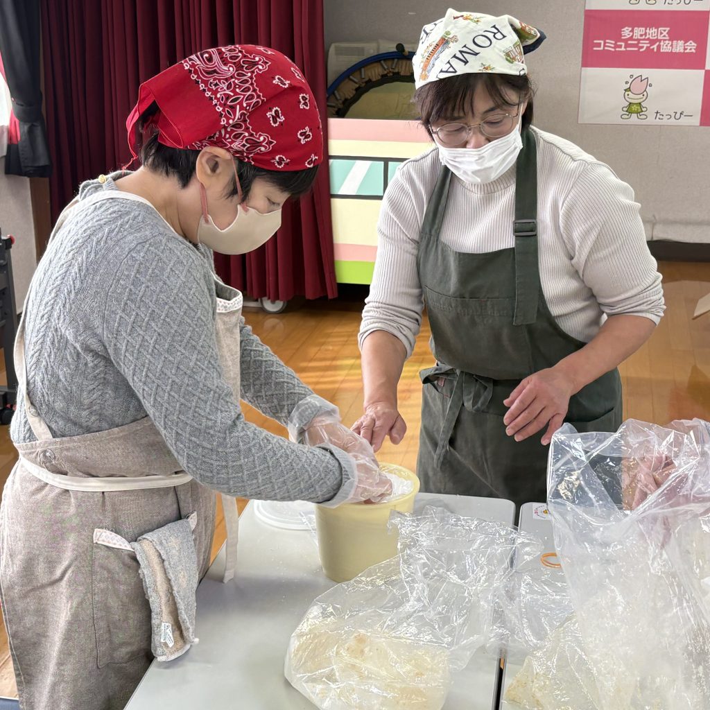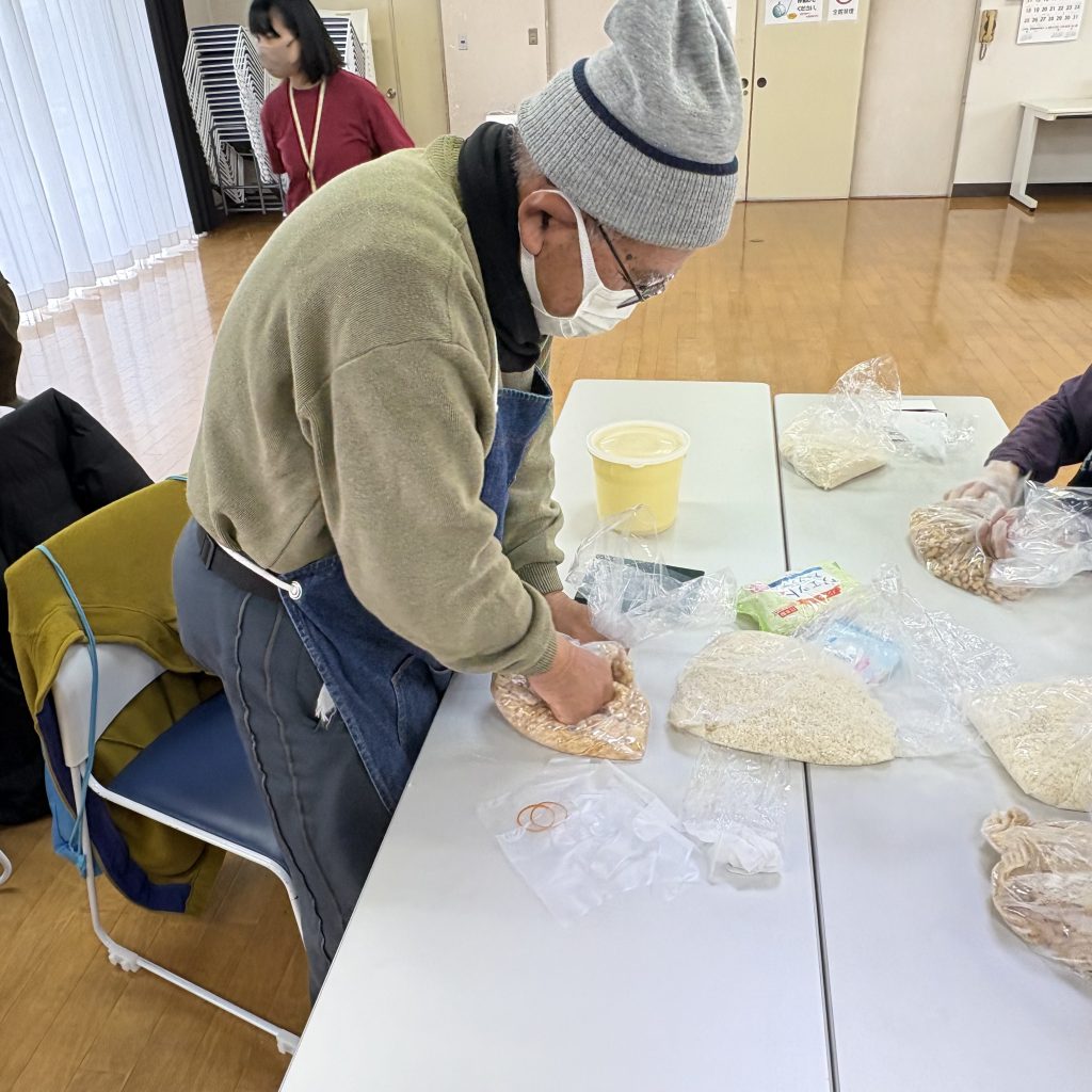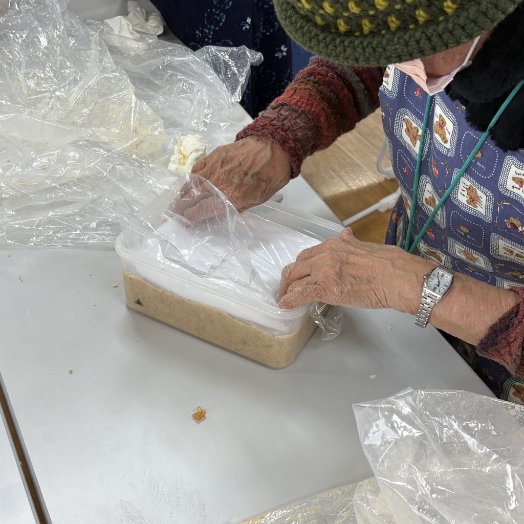 先生に一つ一つ手順を教わって、麹を混ぜて、大豆を潰して、しっかり混ぜて揉み揉み揉み。
