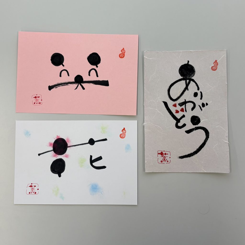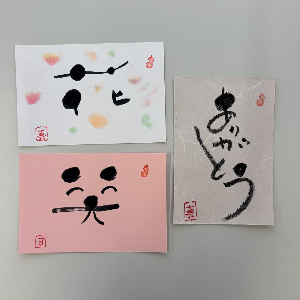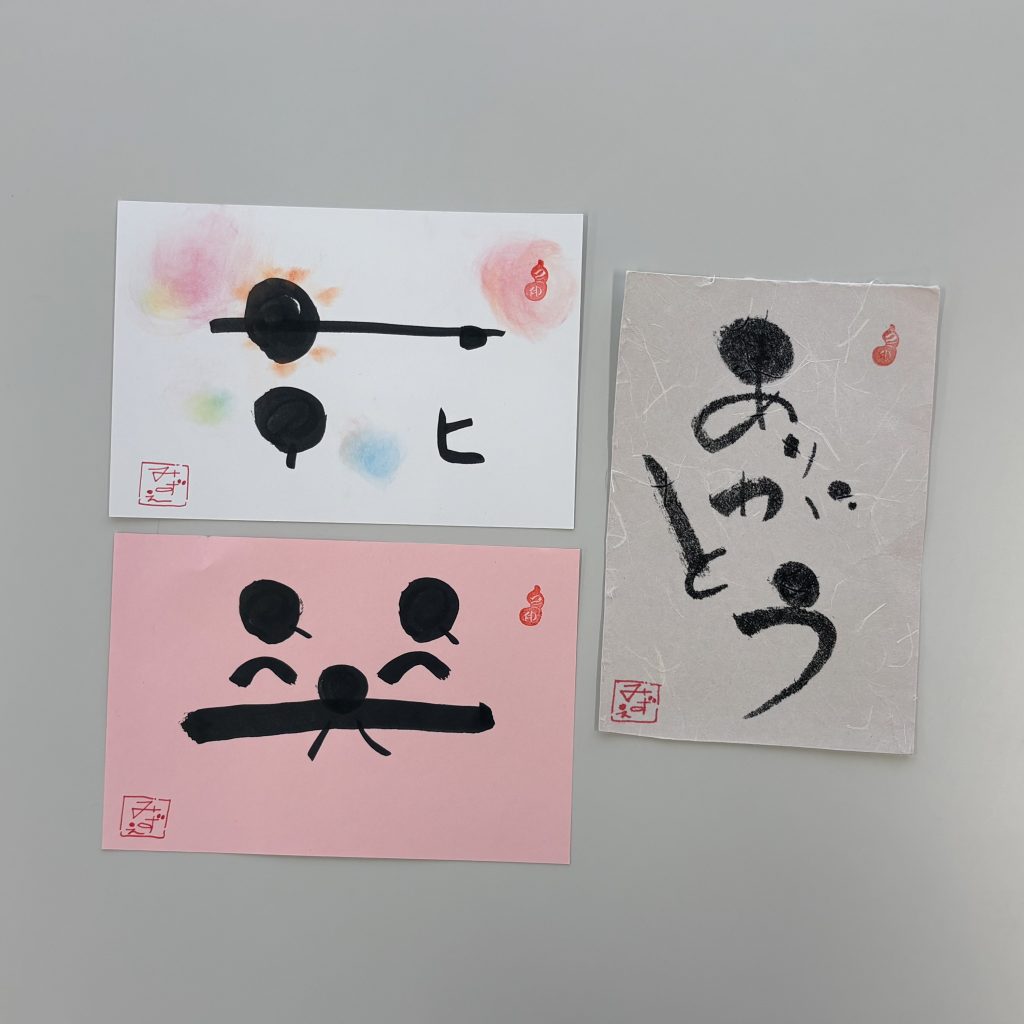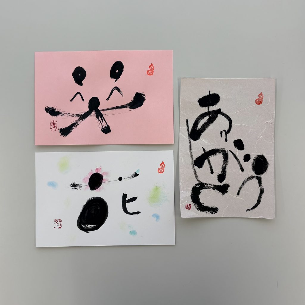 筆ペンで丸や線を書く練習をして、「ありがとう」「笑」「花」の文字を書きました。