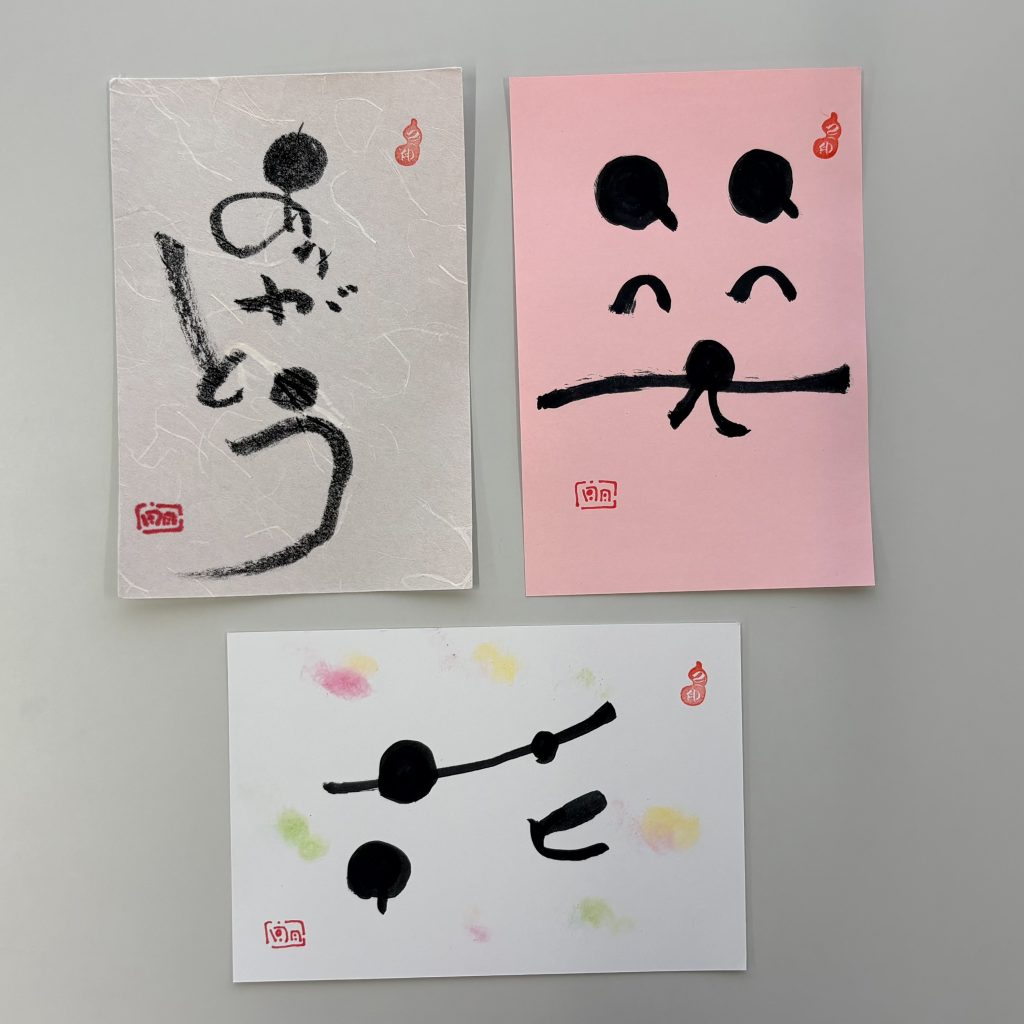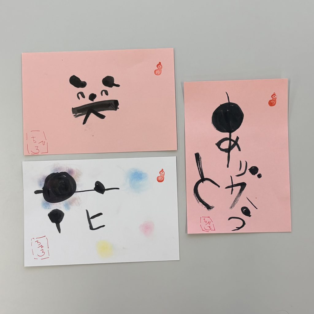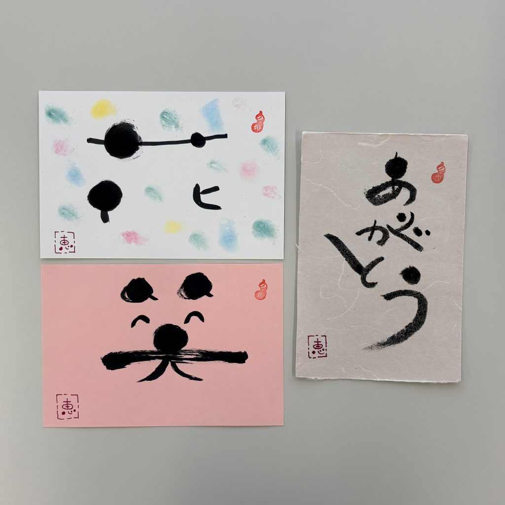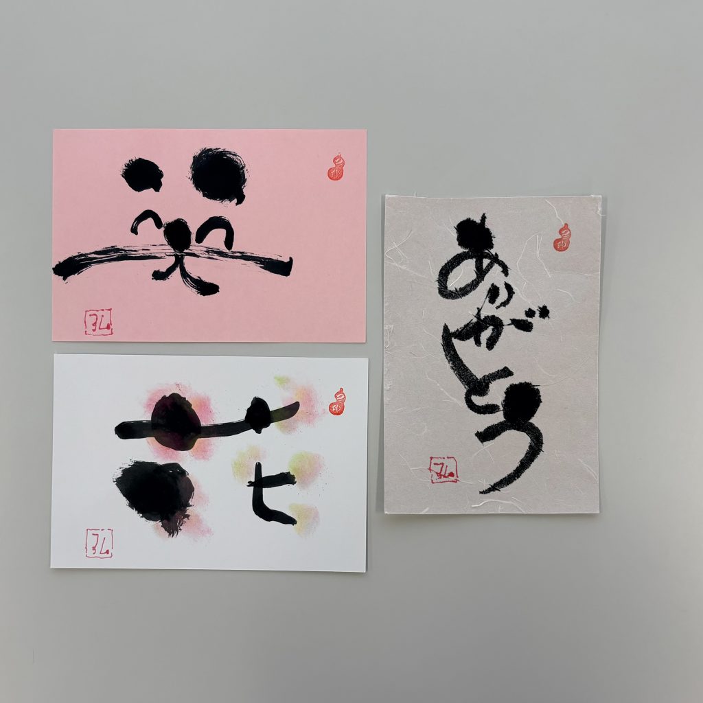 筆ペンで丸や線を書く練習をして、「ありがとう」「笑」「花」の文字を書きました。