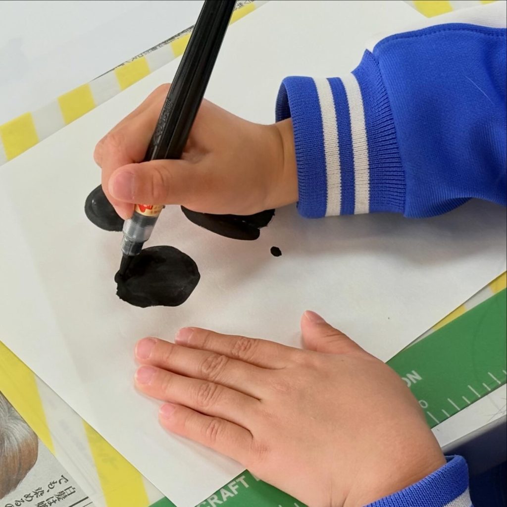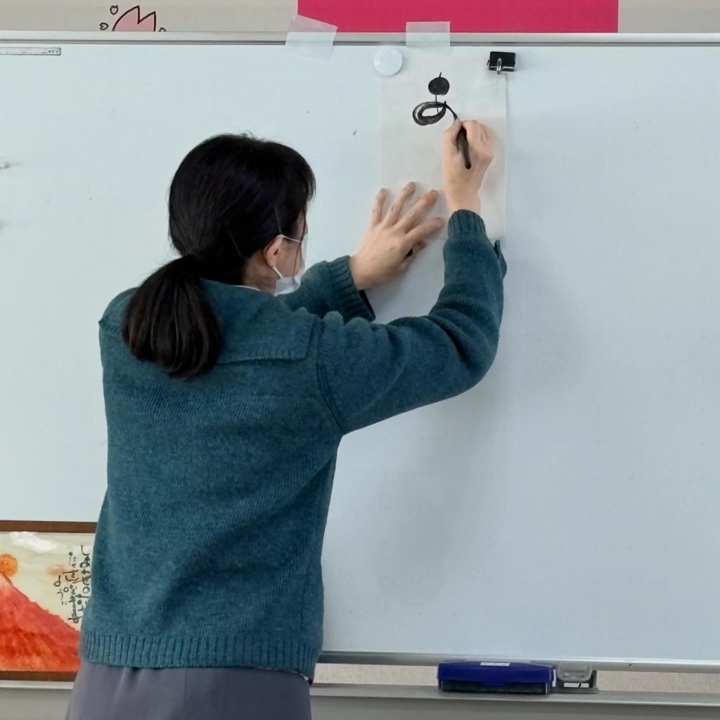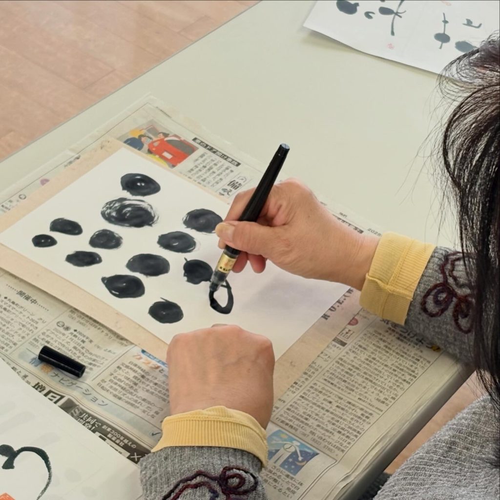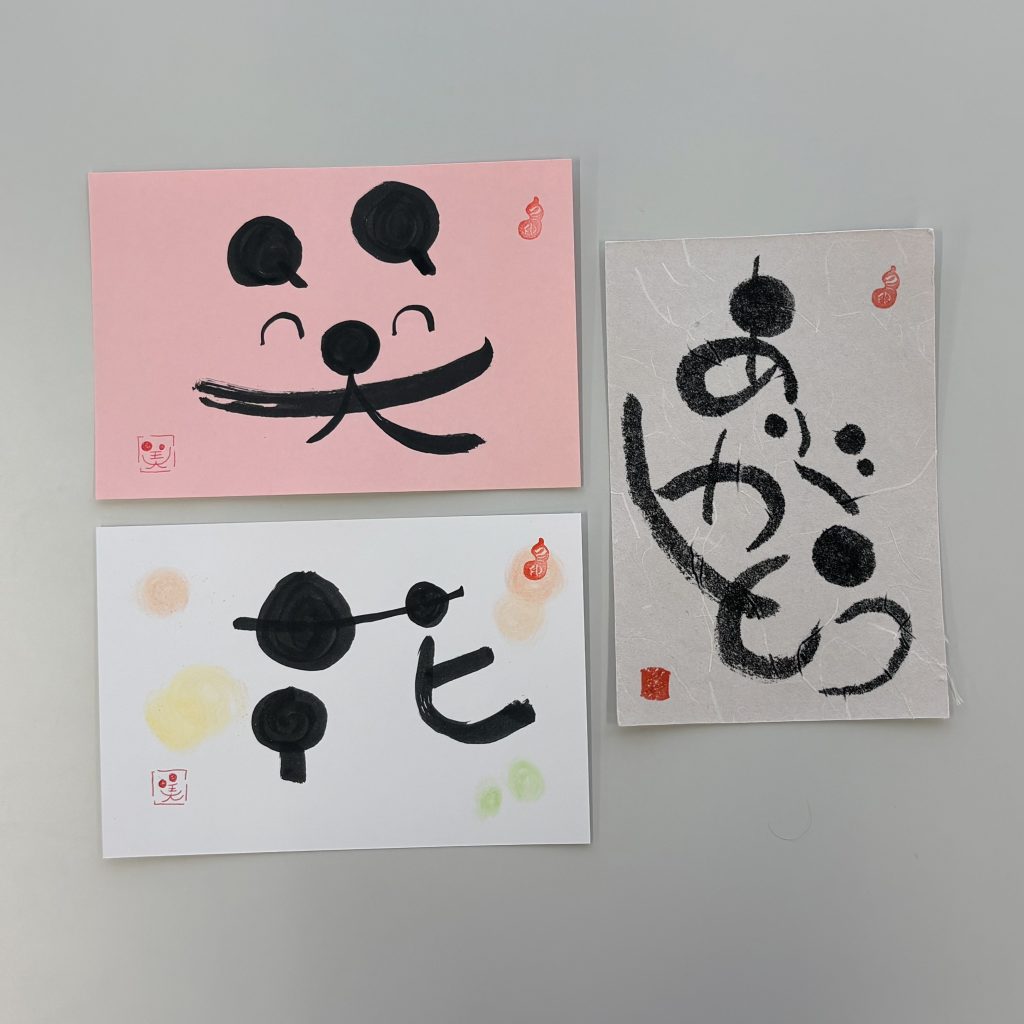 筆ペンで丸や線を書く練習をして、「ありがとう」「笑」「花」の文字を書きました。
