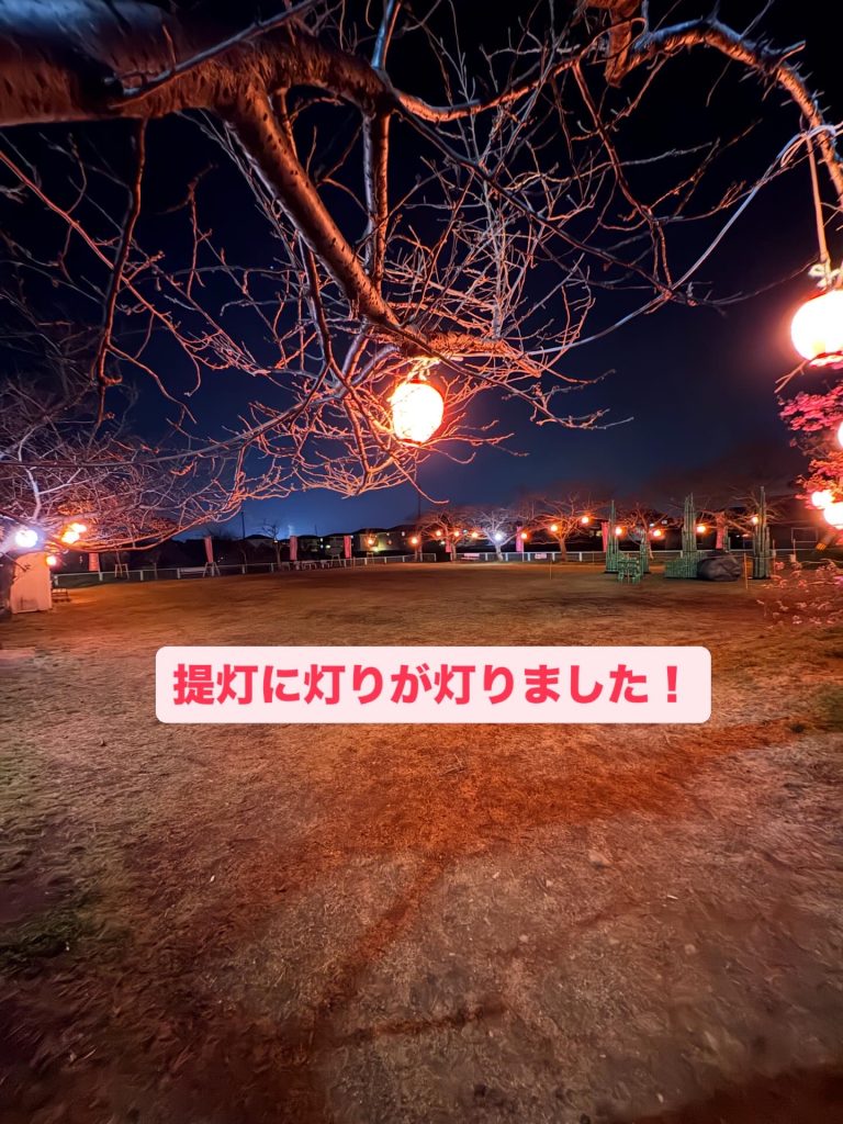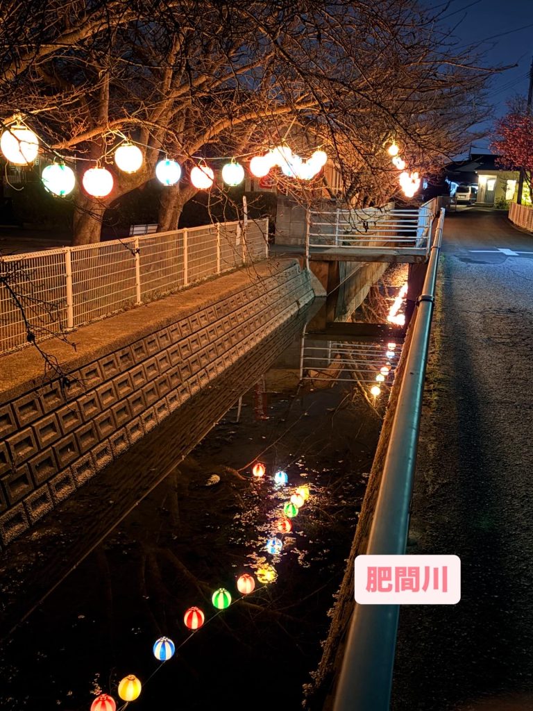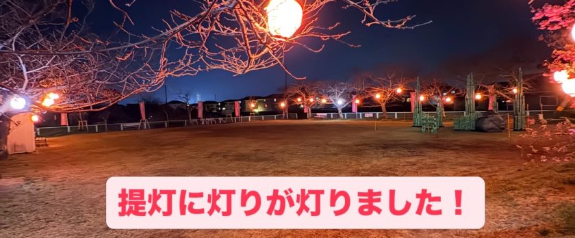 さくら公園と肥間川の桜に、提灯の灯りが灯っています