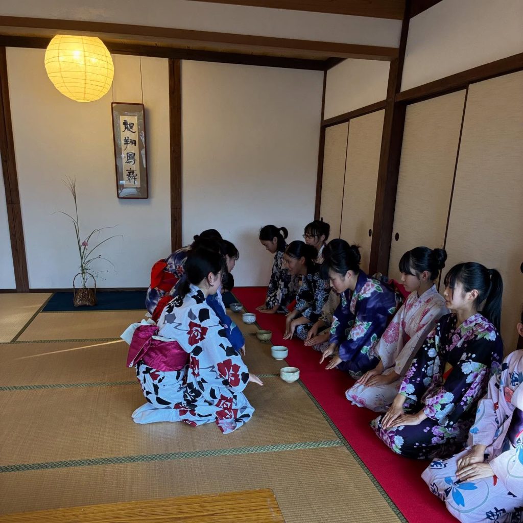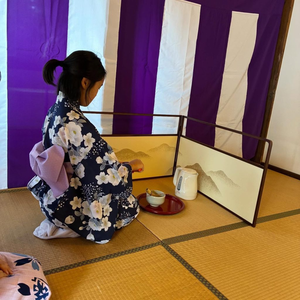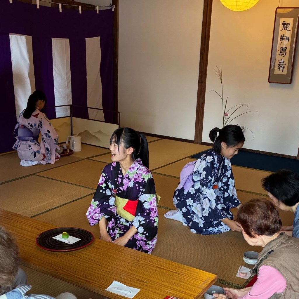10/4(土)、櫻木神社にて、さくらカフェが開催されました龍雲中学校伝統文化継承部の部員さんたちが、浴衣を着てお出迎え、お茶をたてて接待してくれました