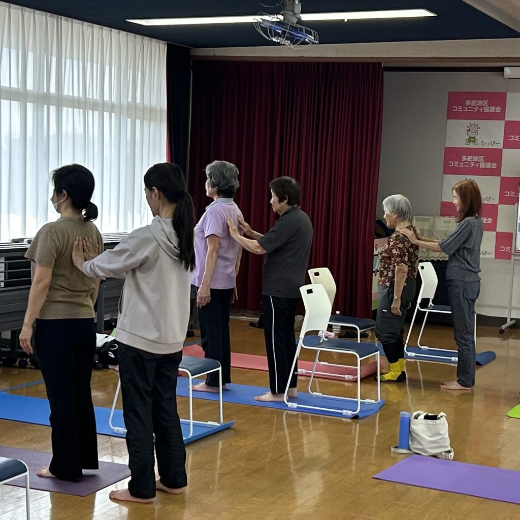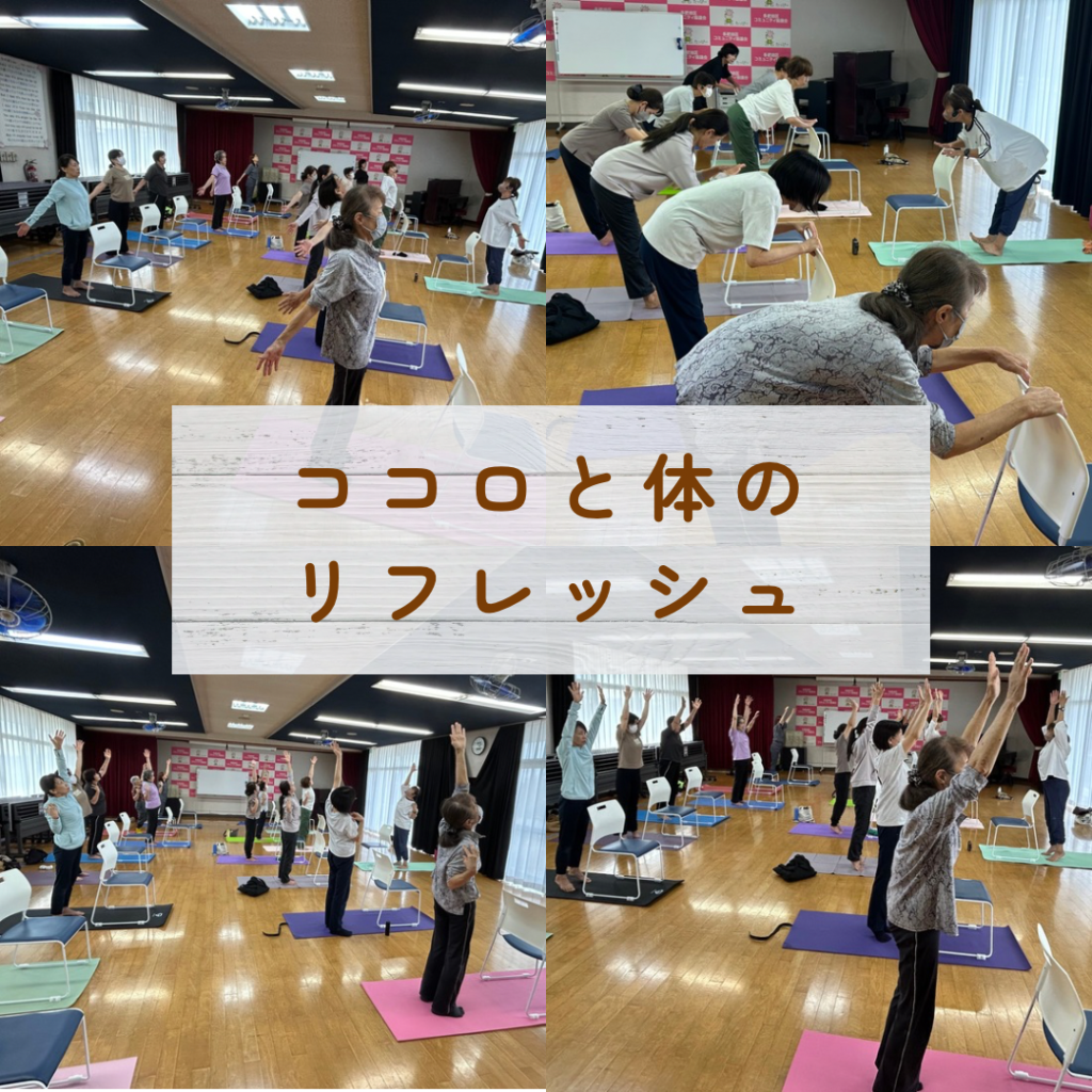 センター講座「ココロと体のリフレッシュ」どこの筋肉が伸びているかを感じながら、骨盤を動かしたり、身体全体を使った運動。2人1組になって、動かす前と後の身体の違いも確認しました!