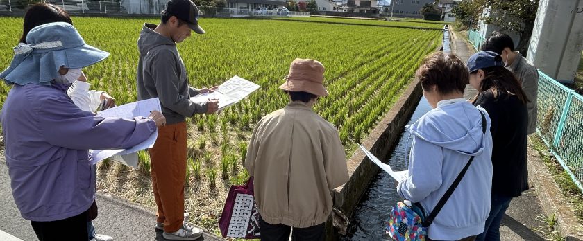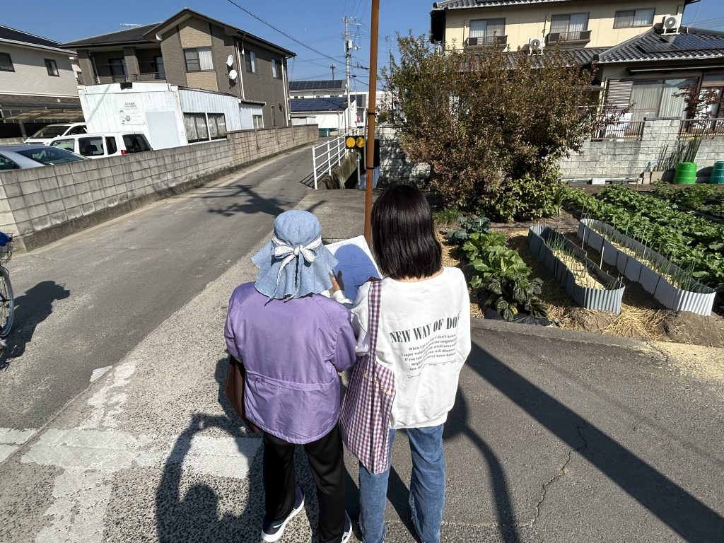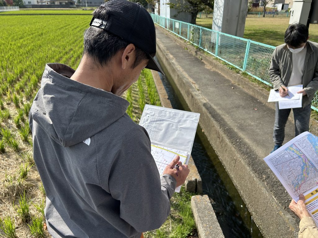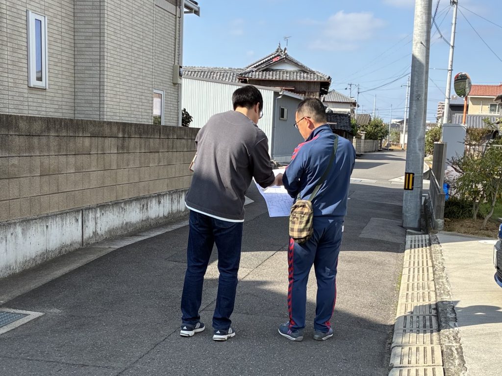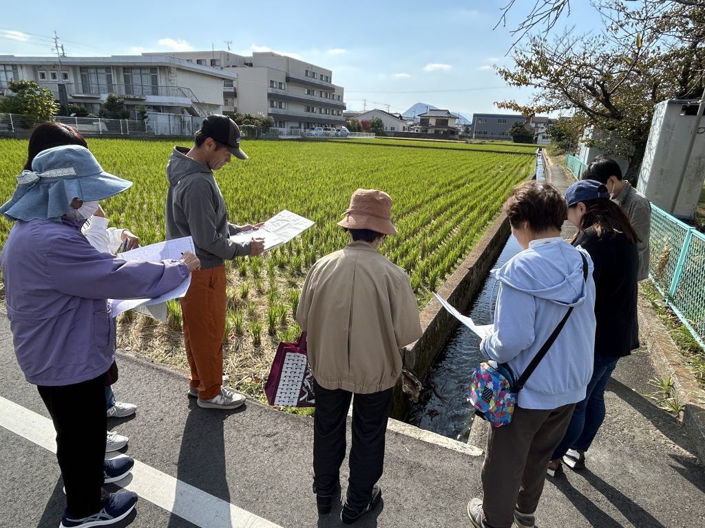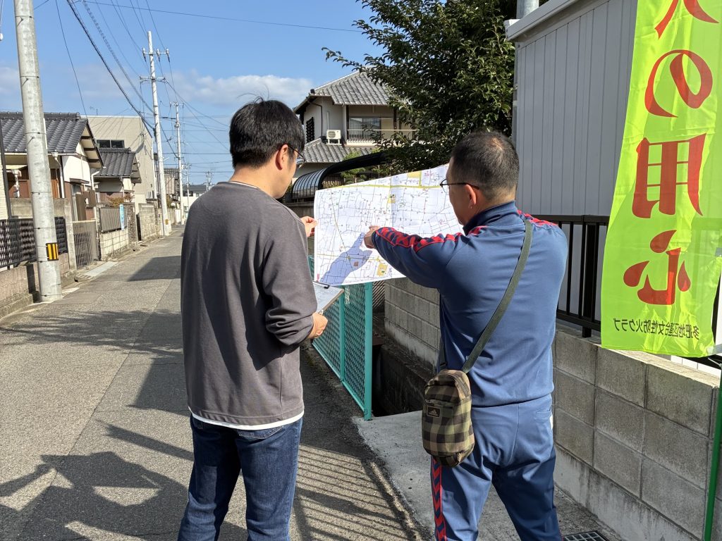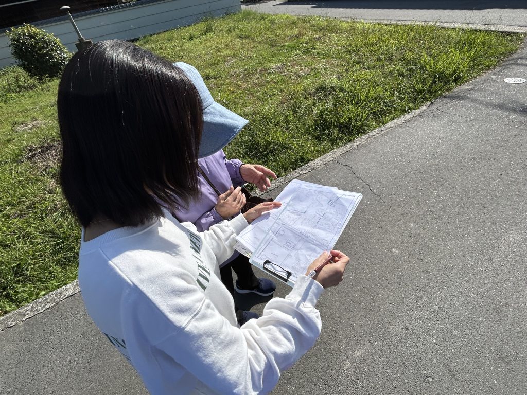 電柱の上部のトランス、柵のない水路、一時避難場所の確認等、防災の視点で、グループ毎に歩いて確認作業を行いました。