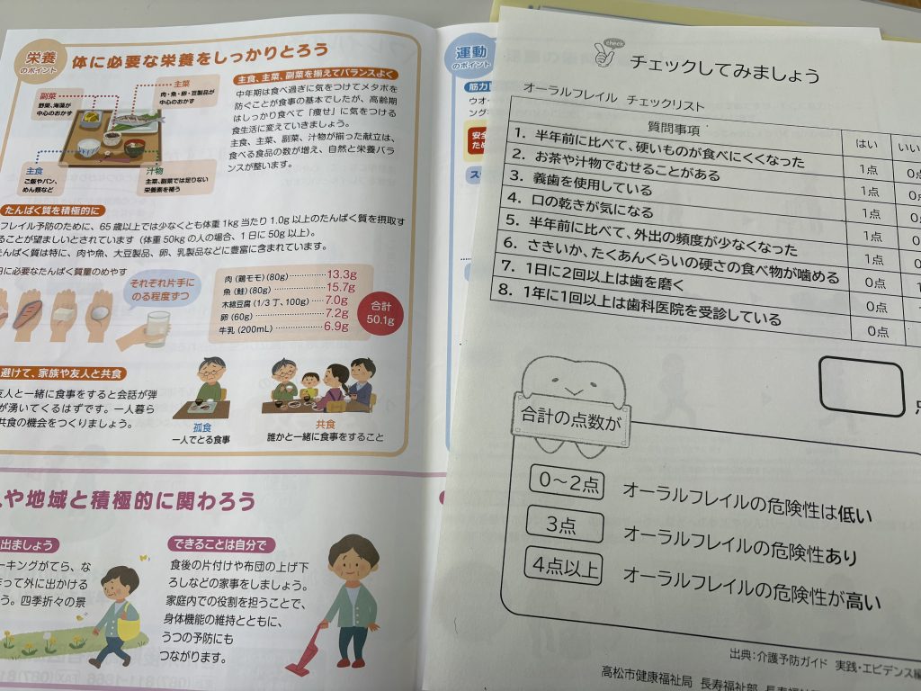 まずはチェックシートで、自分の状態を知り、予防するために、運動、栄養、社会参加、口腔について教えてもらいました。